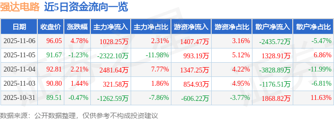 证券之星消息,截至2025年11月6日收盘,强达电路(301628)报收于96.05元,上涨4.78%,换手率14.43%,成交量4.71万手,成交额4.46亿...