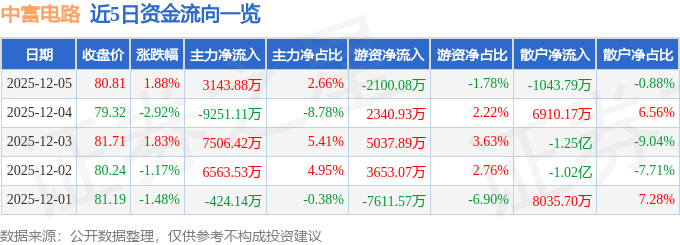 证券之星消息,截至2025年12月5日收盘,中富电路(300814)报收于80.81元,上涨1.88%,换手率7.72%,成交量14.78万手,成交额11.82...
