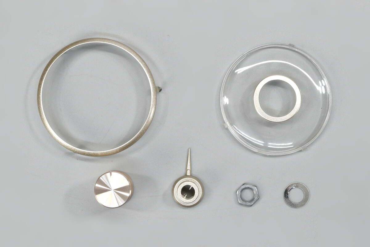 调节旋钮,指针、装饰盘和固定螺丝特写。