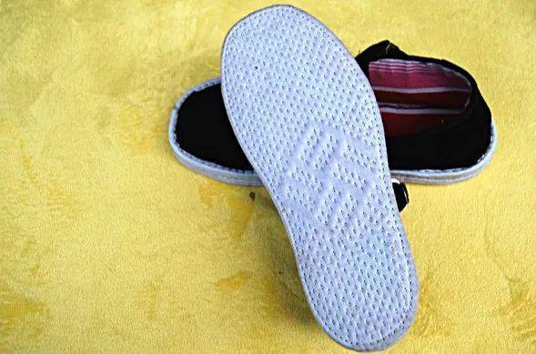 再接着是制作鞋面及上好鞋面。通常用灯芯绒布面,黑色居多,红色较少,红显喜庆适于姐妹穿。鞋口比较讲究,需要用质地细密的哔叽布条,有弹性,便于穿鞋。鞋面和鞋底一经缝合,一双新鞋便做好了,可谓是巧夺天工。当然,这样还不能马上穿,因为鞋没有得到尽情舒展。