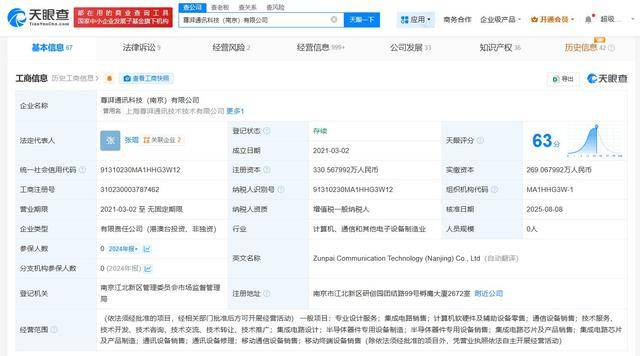 天眼查App显示,尊湃通讯科技(南京)有限公司成立于2021年3月,法定代表人为张琨,注册资本约330万人民币,经营范围包括集成电路销售、集成电路芯片及产品销售等。股东信息显示,该公司由张琨、西安欣柯嘉名股权投资合伙企业(有限合伙)、上海安捷投资有限公司等共同持股。天眼风险信息显示,该公司及旗下公司曾被海思技术有限公司申请诉前财产保全,冻结9500万元财产。值得注意的是,2024年9月,该公司因通过登记的住所或者经营场所无法联系,被列入经营异常名录。