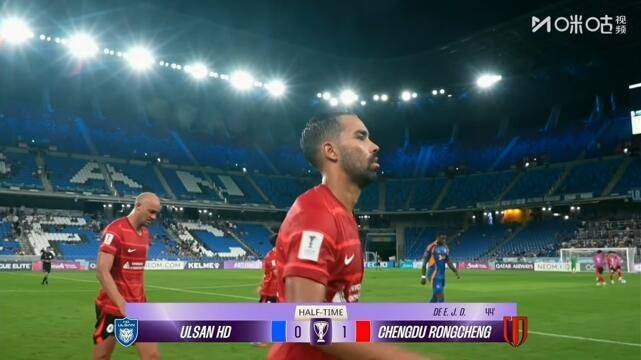 直播吧9月17日讯 亚冠精英联赛第一轮,成都蓉城上半场客场1-0领先蔚山HD。