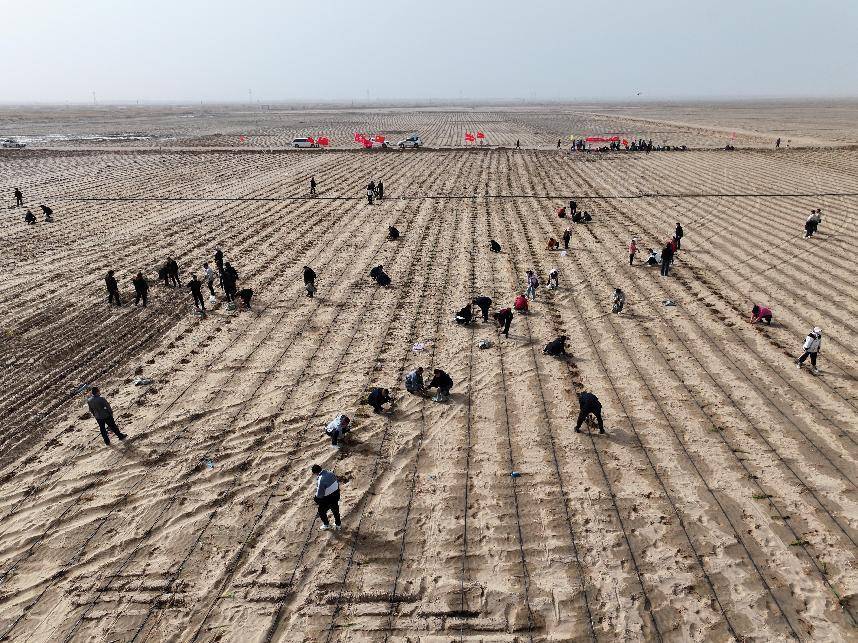 阿拉尔十团昌安镇千亩种植区,栽种芦竹苗现场。(兵团第一师融媒体中心程永超 摄)