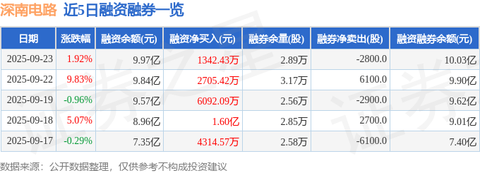 深南电路融资融券信息显示,融资方面,当日融资买入2.38亿元,融资偿还2.25亿元,融资净买入1342.43万元,连续3日净买入累计1.01亿元。融券方面,融券卖出2300.0股,融券偿还5100.0股,融券余量2.89万股,融券余额632.9万元。融资融券余额10.03亿元。