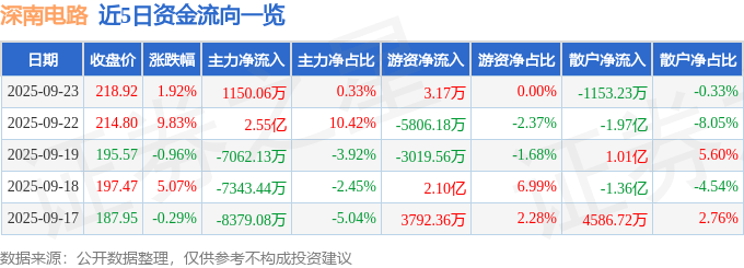 证券之星消息,截至2025年9月23日收盘,深南电路(002916)报收于218.92元,上涨1.92%,换手率2.35%,成交量15.66万手,成交额34.44亿元。