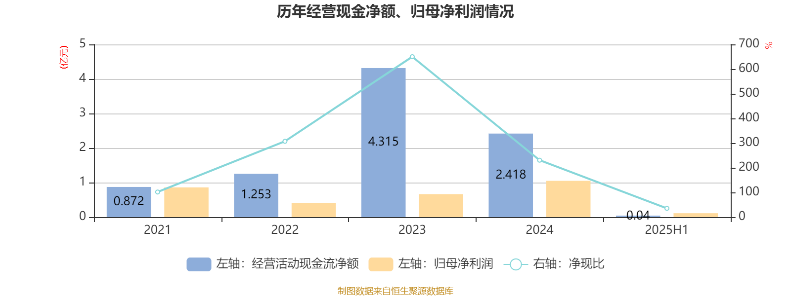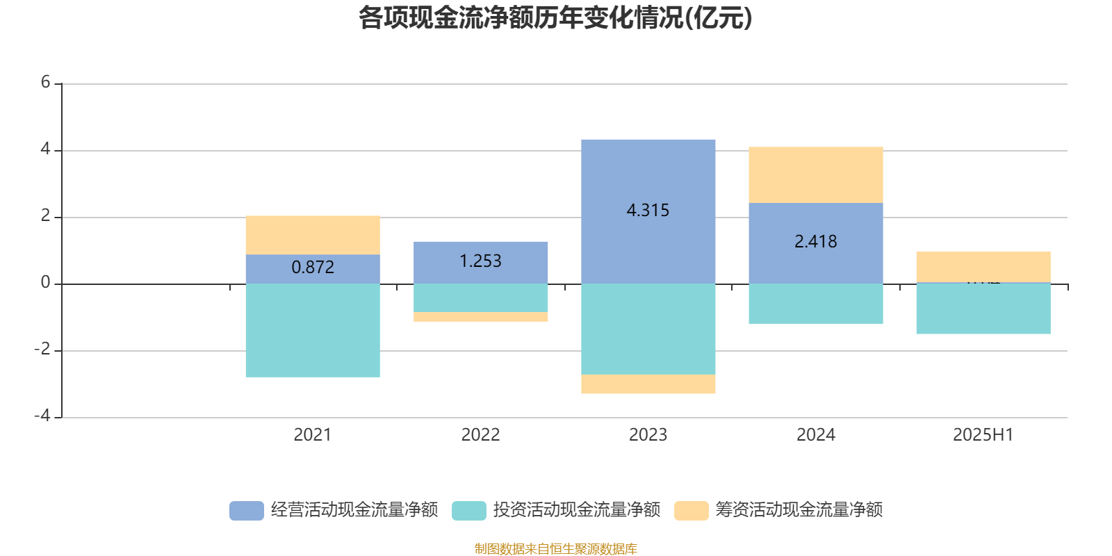 2025年上半年,公司经营活动现金流净额为396.6万元;筹资活动现金流净额9186万元;投资活动现金流净额-1.51亿元。