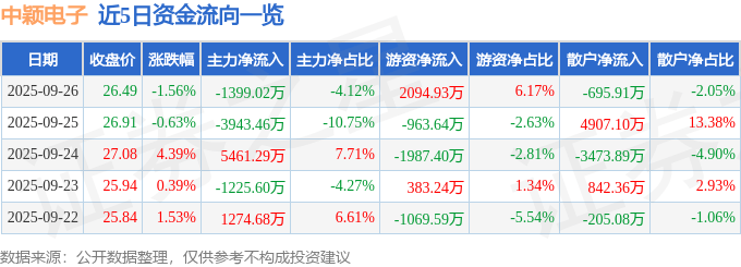 证券之星消息,截至2025年9月26日收盘,中颖电子(300327)报收于26.49元,下跌1.56%,换手率3.71%,成交量12.64万手,成交额3.4亿元。