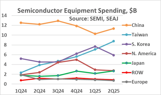 可以看到,最近这6个季度以来,中国大陆一直是排在全球第一名的。到2025年二季度时,中国大陆采购的芯片设备规模,高达113.6亿美元,占到全球比例的34%,这也是中国大陆的市场规模,首次超过全球的三分之一(33%)。