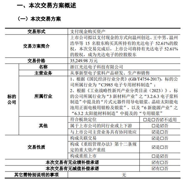 草案称,光达电子作为光伏金属化综合解决方案的领先厂商,产品技术水平位居行业前列。报告期内标的公司经营业绩快速增长,在重点客户的出货量及市场份额稳步提升。上市公司实际控制人家族持续深耕电学金属材料,若本次交易成功实施,上市公司将在电接触行业的触头材料、复层触头、触头组件基础上,新增电子浆料业务,进一步丰富电学金属材料产业链,有助于上市公司打造业绩第二增长曲线,提高公司的整体竞争力,符合国家产业政策和公司发展需求,符合公司及股东利益。光伏行业在全球双碳目标持续推进以及国内外利好政策的带动下,正处于高质量发展期,导电浆料作为核心辅材将迎来快速发展机遇。标的公司具有较高的市场地位与较强的盈利能力,若本次交易成功实施,将借助上市公司平台获得多方面的协同支持,进一步释放业务发展潜力。上市公司通过本次交易其资产规模、营业收入与净利润水平将显著提升,基本每股收益亦得到增厚,整体盈利能力和综合竞争力进一步增强。综上,本次交易对上市公司未来发展具有积极意义,符合全体股东的利益。