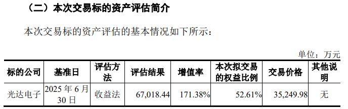 本次交易采用收益法评估结果作为定价依据。以2025年6月30日为基准日,光达电子100%股权评估值为6.70亿元,较账面净资产2.47亿元增值171.38%。