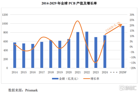 据Prismark数据,2024年受益于AI服务器及相关高速网络基础设施推动,以及智能手机市场复苏,全球PCB产值同比增长5.8%至735.65亿美元。