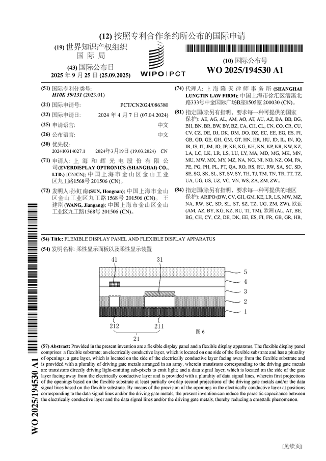 证券之星消息,根据企查查数据显示和辉光电(688538)公布了一项国际专利申请,专利名为“柔性显示面板以及柔性显示装置”,专利申请号为PCT/CN2024/086380,国际公布日为2025年9月25日。