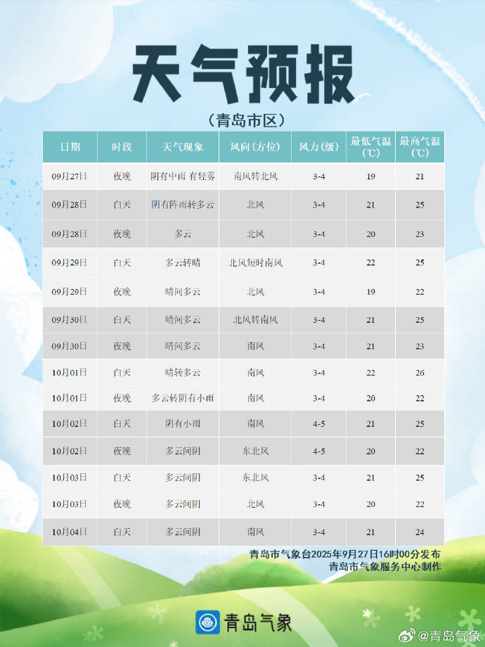 信网9月28日讯据@青岛气象最新消息,9月28日白天青岛仍有阵雨天气,下午降雨结束,逐渐恢复为多云天。气温方面各区市的最高气温相差不大,在24℃~25℃,29日天气逐渐转晴,全市最高气温小幅回升到25℃~27℃。未来三天,青岛市南北风交替,风力柔和,早晚凉意尽显,请适时调整着装,谨防感冒。