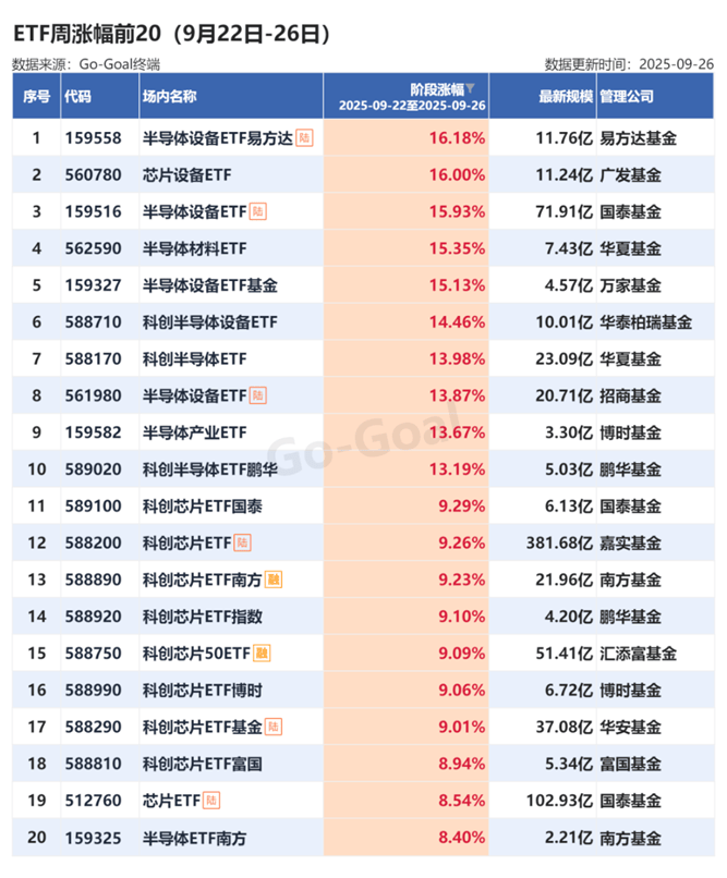 本周,A股主要指数震荡走强,上证指数全周上涨0.21%,深证成指上涨1.06%,创业板指上涨1.96%。Go-Goal ETF数据显示,半导体设备为本周市场热点,多只半导体设备相关ETF涨幅居前。