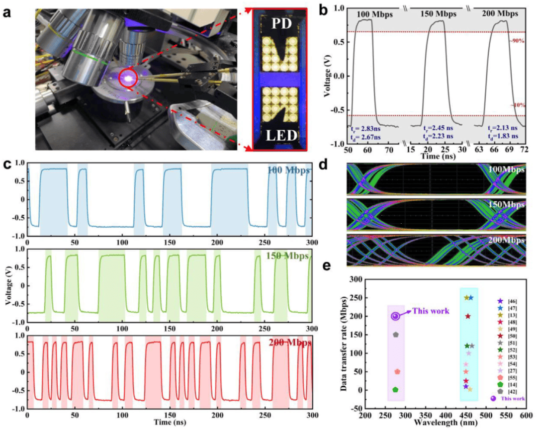 图:AlGaN基Mini -MQWs结构集成系统的片上测试结果及与当前已发表的氮化物集成器件传输速率的对比