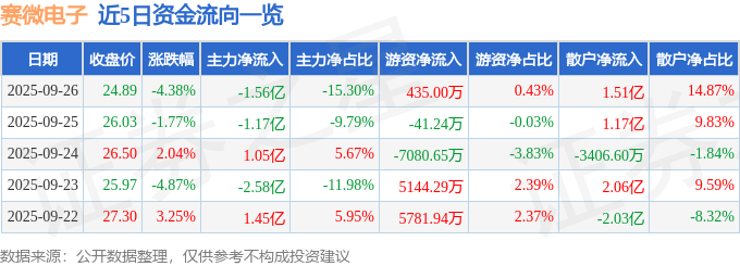 证券之星消息,截至2025年9月26日收盘,赛微电子(300456)报收于24.89元,下跌4.38%,换手率6.74%,成交量40.26万手,成交额10.17亿元。