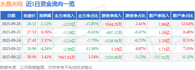 证券之星消息,截至2025年9月26日收盘,水晶光电(002273)报收于26.12元,下跌5.12%,换手率4.06%,成交量55.27万手,成交额14.7亿元。