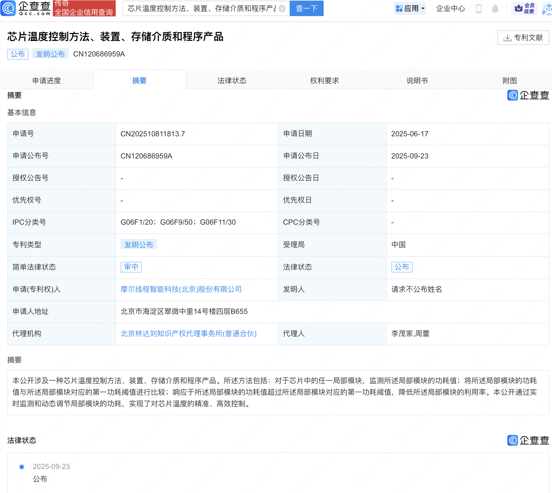 企查查APP显示,近日,摩尔线程智能科技(北京)股份有限公司“芯片温度控制方法、装置、存储介质和程序产品”专利公布。企查查专利摘要显示,所述方法包括:对于芯片中的任一局部模块,监测所述局部模块的功耗值;将所述局部模块的功耗值与所述局部模块对应的第一功耗阈值进行比较;响应于所述局部模块的功耗值超过所述局部模块对应的第一功耗阈值,降低所述局部模块的利用率。本公开通过实时监测和动态调节局部模块的功耗,实现了对芯片温度的精准、高效控制。