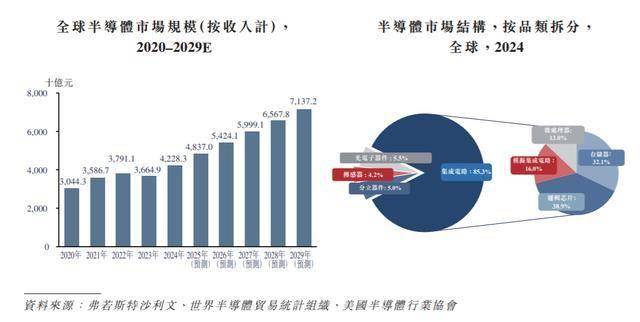 全球半导体市场在2020年至2024年期间实现了显著增长,市场规模从2020年的人民币3.0万亿元攀升至2024年的人民币4.2万亿元,复合年增长率达到8.6%。展望未来,AI、新能源、辅助驾驶、具身智能及工业自动化需求的增长将带动半导体市场规模持续扩大,2025年至2029年,复合年增长率将达到10.2%,2029年市场规模将达到人民币7.1万亿元。