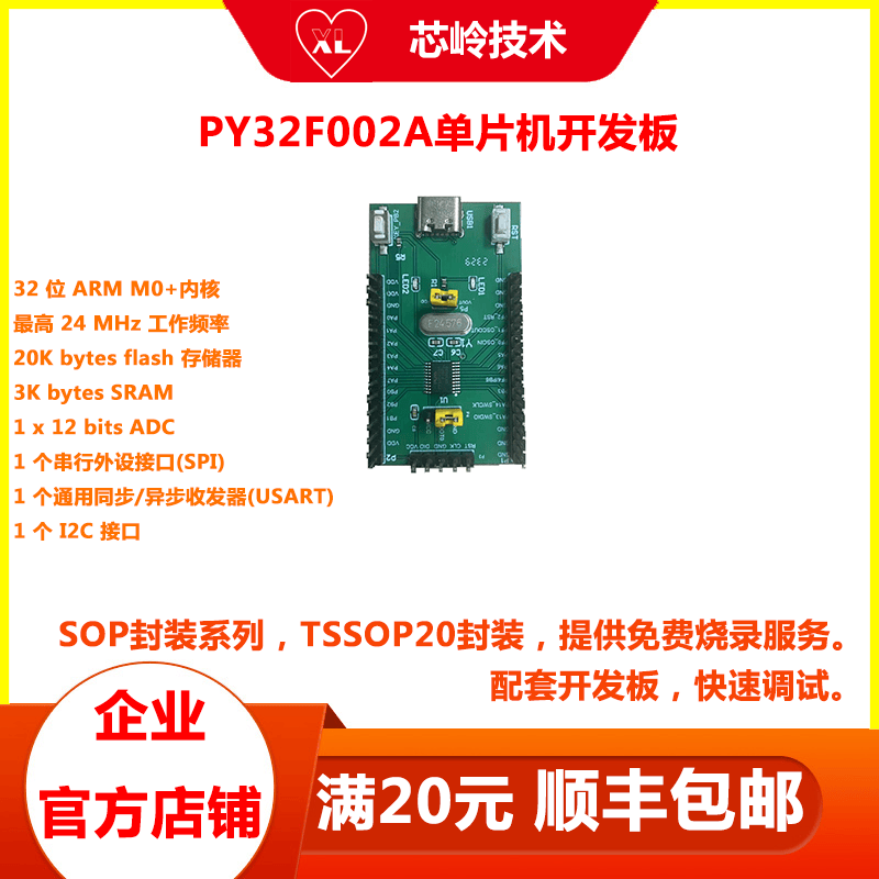 我们的PY32F002A 开发板上搭载的芯片是PY32F002AF15P6单片机,TSSOP20封装,开发板使用Type C接口供电,可以用来对PY32F002A芯片进行开发调试。开发板均测试功能完好后发货,板子到手即可开始使用。