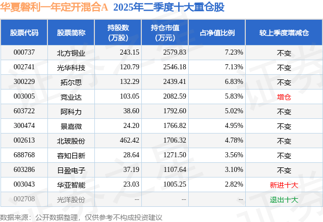 根据2025基金半年报公募基金重仓股数据,重仓该股的公募基金共3家,其中持有数量最多的公募基金为华夏基金的华夏磐利一年定开混合A。华夏磐利一年定开混合A目前规模为3.34亿元,最新净值1.8615(9月26日),较上一交易日下跌1.76%,近一年上涨68.46%。该公募基金现任基金经理为张城源。张城源在任的基金产品包括:华夏磐泰混合(LOF)A,管理时间为2016年12月26日至今,期间收益率为77.95%;华夏磐锐一年定开混合A,管理时间为2020年12月22日至今,期间收益率为76.59%;华夏磐益一年定开混合,管理时间为2021年1月26日至今,期间收益率为49.11%。