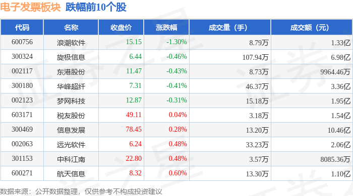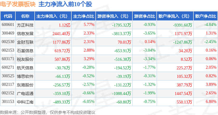 从资金流向上来看,当日电子发票板块主力资金净流入1489.98万元,游资资金净流出5439.0万元,散户资金净流入3949.02万元。电子发票板块个股资金流向见下表: