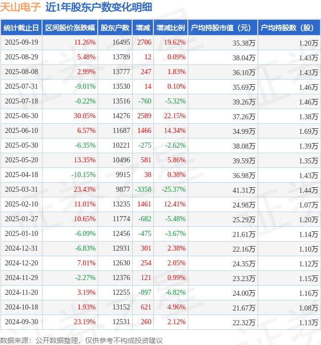 从股价来看,2025年8月29日至2025年9月19日,天山电子区间涨幅为11.26%,在此期间股东户数增加2706.0户,增幅为19.62%。