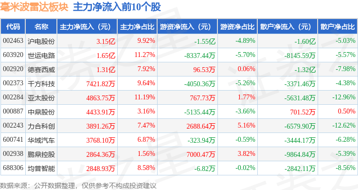 从资金流向上来看,当日毫米波雷达板块主力资金净流出10.15亿元,游资资金净流入2.73亿元,散户资金净流入7.43亿元。毫米波雷达板块个股资金流向见下表: