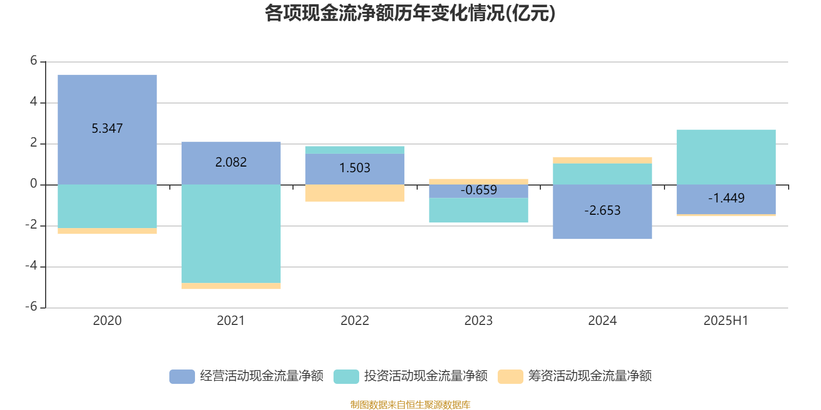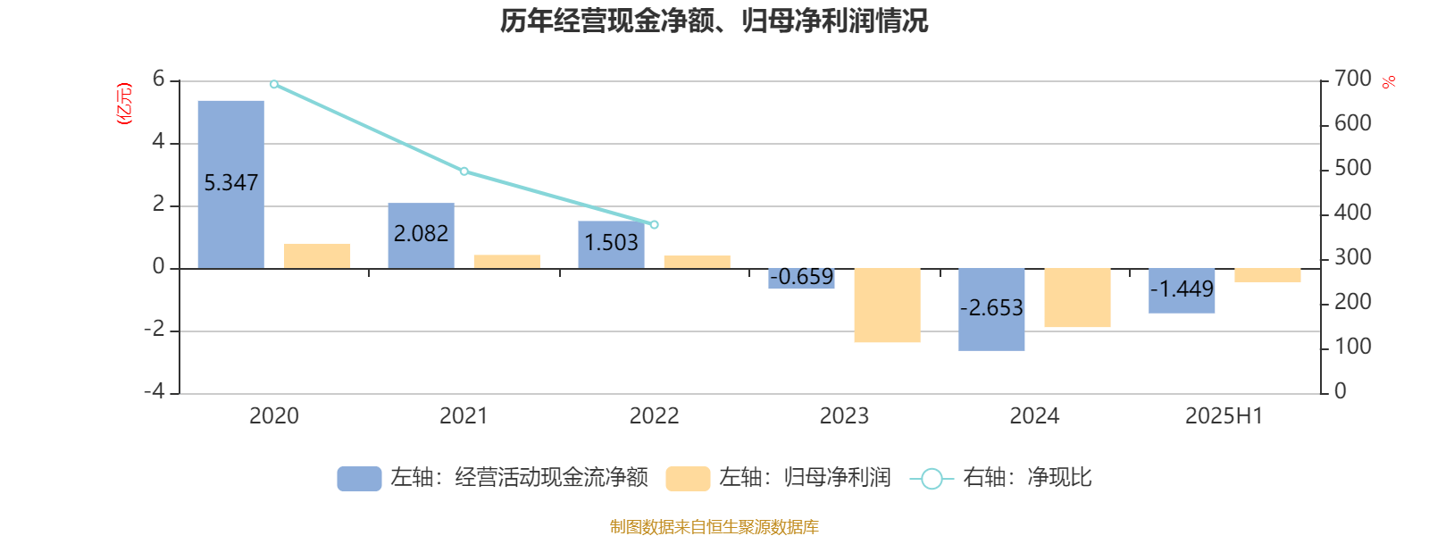 2025年上半年,公司经营活动现金流净额为-1.45亿元;筹资活动现金流净额-872.94万元;投资活动现金流净额2.67亿元。