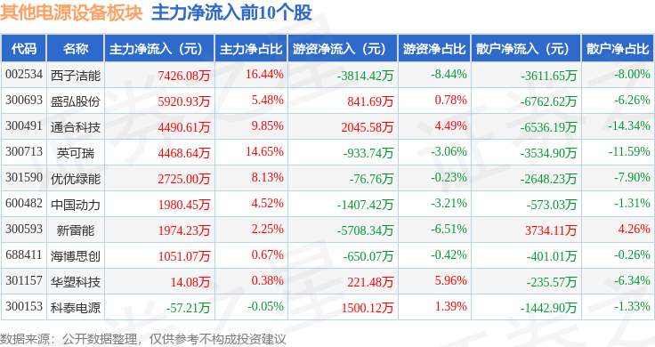 从资金流向上来看,当日其他电源设备板块主力资金净流出10.84亿元,游资资金净流入2.42亿元,散户资金净流入8.43亿元。其他电源设备板块个股资金流向见下表: