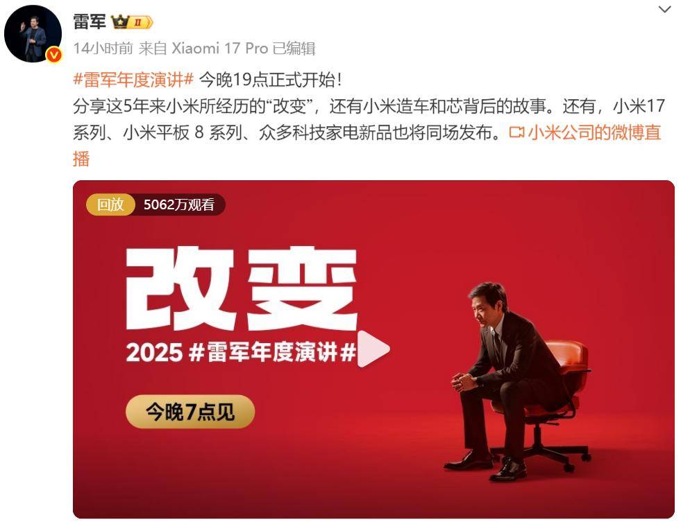 雷军的这番话或是在为9月25日举办的个人第六场演讲铺垫。其个人微博也在9月25日提前作出预告。在微博发文中已经透露演讲时会有小米17、小米平板8系列等新品发布。截至9月26日,雷军以《改变》为主题的个人第六次演讲在线观看人数已经超过5000万,