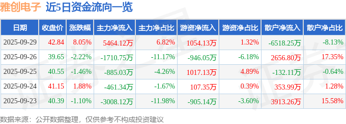 证券之星消息,截至2025年9月29日收盘,雅创电子(301099)报收于42.84元,上涨8.05%,换手率20.54%,成交量18.44万手,成交额8.02亿元。