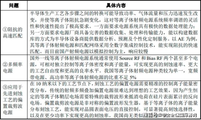 (2)等离子体射频电源系统由国际头部厂商垄断,极少数国产厂商参与:等离子体射频电源系统市场呈现高度集中的竞争格局,主要以美国的MKS和AE为主。由于我国半导体制造行业起步较晚,目前国产等离子体射频电源系统相较于国际头部厂商的产品在电源波形、频率和功率,以及精准控制等离子体浓度、均匀度等方面存在差距,特别在阻抗的高速匹配、多频率电源、应用于先进刻蚀工艺的偏置裁剪波电源等产品上,国产射频电源发展滞后,具体如下表: