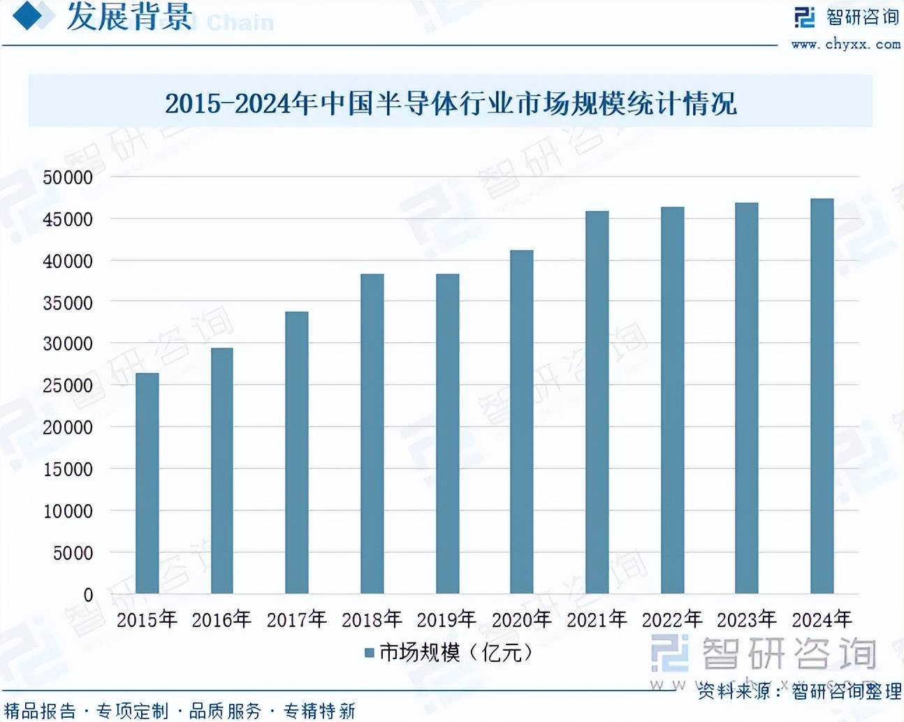 半导体作为现代科技产业的核心,是推动经济发展与科技创新的关键力量。近年来,半导体行业国产自主化进程备受关注,其不仅关乎产业安全,更对国家综合竞争力有着深远影响。在全球半导体市场中,中国已经连续多年占据近三分之一份额。但长期以来,我国半导体产业严重依赖进口,核心技术受制于人,面临“卡脖子”困境。特别是2022年以来,美国多次出台出口管制措施,限制先进制程芯片与半导体制造设备出口,给我国半导体产业带来冲击与挑战,也使得国产自主化的紧迫性大幅提升。在此背景下,我国相继出台《制造业可靠性提升实施意见》《关于推动未来产业创新发展的实施意见》《深圳市关于促进半导体与集成电路产业高质量发展的若干措施》等多项政策支持半导体行业发展,同时在市场需求与企业努力等多因素推动下,国产自主化进程取得显著进展,为半导体射频电源行业发展提供良好的发展环境。据统计,中国半导体行业市场规模从2015年的26385.73亿元增长至2024年的47344.73亿元,年复合增长率为6.71%。