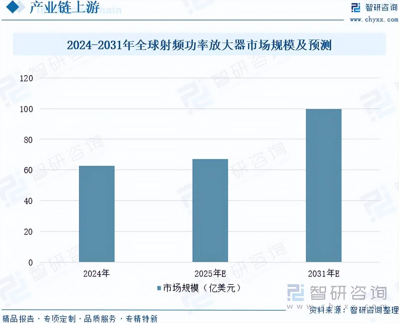 射频功率放大器是半导体射频电源的核心部件,主要将普通电源输出的低电压信号放大至高频、高电压的信号。在无线通信技术迅猛发展的当下,射频功率放大器作为信号放大的关键环节,正以前所未有的速度驱动着市场扩张。从智能手机到通信基站,从物联网设备到卫星通信,射频功率放大器应用广泛,为高速、可靠地信息传输提供了坚实基础。随着5G、物联网和自动驾驶等前沿技术的快速普及,射频功率放大器市场迎来重大发展机遇,展现出强劲的增长潜力。据统计,2024年全球射频功率放大器市场规模已达62.54亿美元,预计到2031年将增长至99.76亿美元,年复合增长率达6.9%。未来,随着射频功率放大器行业的持续发展,将同步带动半导体射频电源行业迈向新的增长阶段。