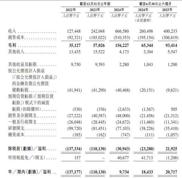 于2022年、2023年、2024年以及截至2025年6月30日止6个月期间,公司收入分别为人民币1.27亿元、2.42亿元、6.67亿元及4.00亿元;年╱期内溢利为-1.37亿元-1.10亿元、973.4万元及2071.7万元,2024年实现扭亏为盈。