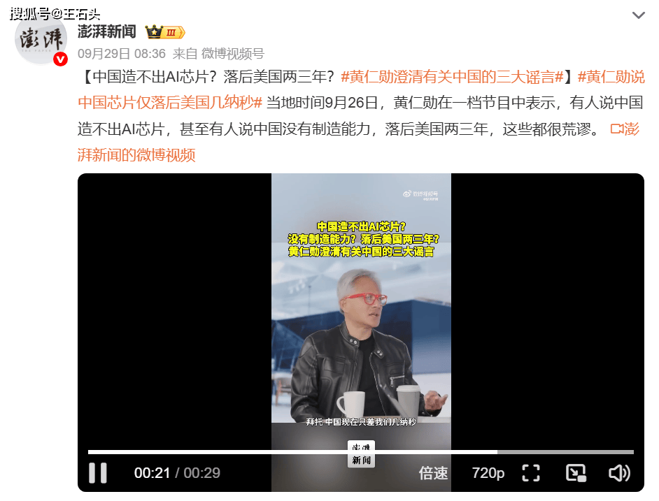 黄仁勋直言不讳地指出,有人认为中国造不出人工智能芯片或没有制造能力,这种说法“非常荒谬”。