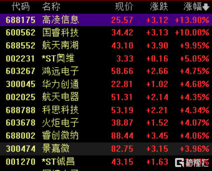 军工电子版快反弹,高凌信息等涨超13%,国睿科技10cm涨,航天南湖涨超9%。