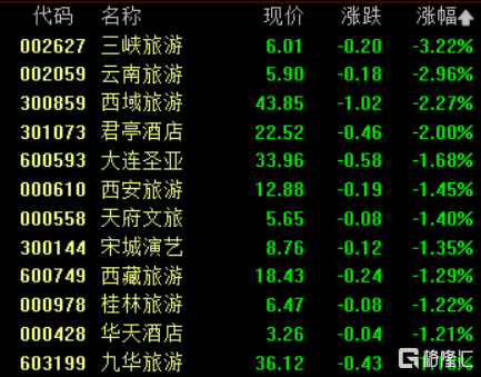 旅游及酒店板块走低,三峡旅游跌超3%,云南旅游、西域旅游等跌超2%。