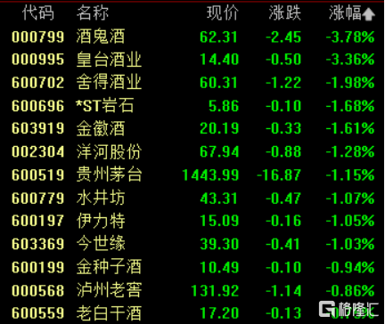 白酒板块下跌,酒鬼酒、皇台酒业跌超3%。舍得酒业、金徽酒等跌超1%。