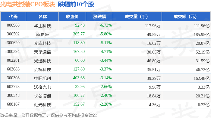 证券之星消息,9月30日光电共封装CPO板块较上一交易日下跌2.36%,华工科技领跌。当日上证指数报收于3882.78,上涨0.52%。深证成指报收于13526.51,上涨0.35%。光电共封装CPO板块个股涨跌见下表: