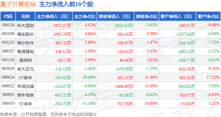 从资金流向上来看,当日量子计算板块主力资金净流出1.83亿元,游资资金净流入5077.34万元,散户资金净流入1.32亿元。量子计算板块个股资金流向见下表: