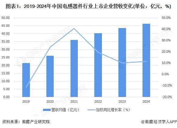 图表1:2019-2024年中国电感器件行业上市企业营收变化(单位:亿元,%)