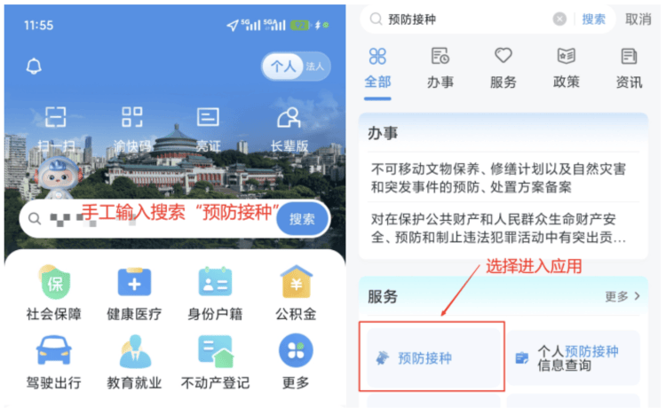 在“渝快办”首页搜索栏搜索“预防接种”,选择服务“预防接种”打开(建议将“预防接种”添加到“我的常用”里面,方便后期使用)。