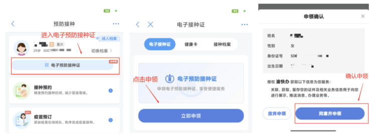 进入“电子预防接种证”,点击“立即申领”,选择“同意并申领”确认。
