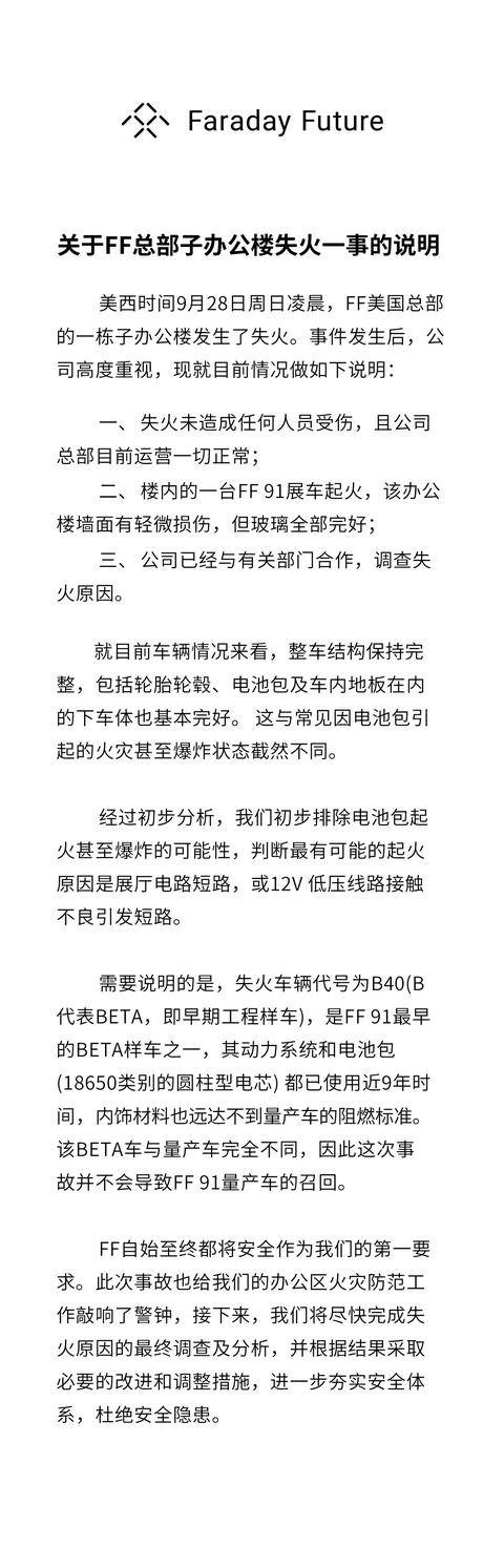 9月30日,法拉第未来@FaradayFuture 发布关于FF总部子办公楼失火一事的说明:美西时间9月28日周日凌晨,FF美国总部的一栋子办公楼发生了失火。失火未造成任何人员受伤,且公司总部目前运营一切正常;楼内的一台FF 91展车起火,但该办公楼墙面有轻微损伤,但玻璃全部完好;公司已经与有关部门合作,调查失火原因。