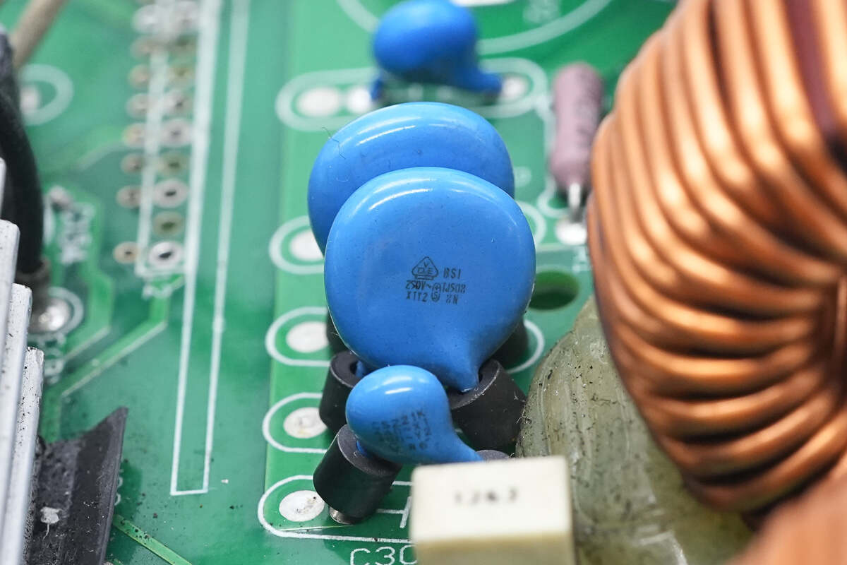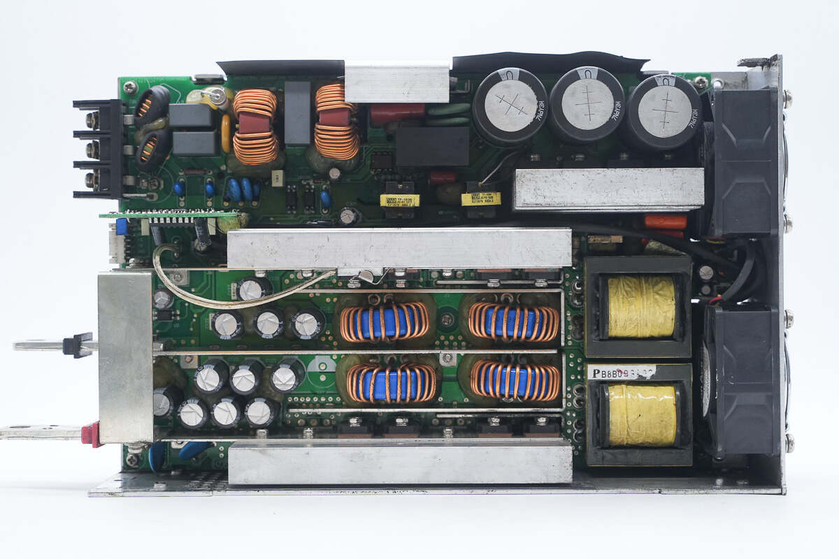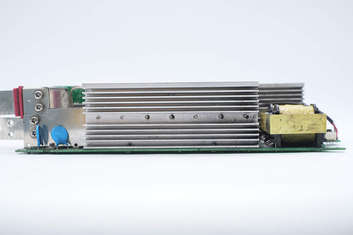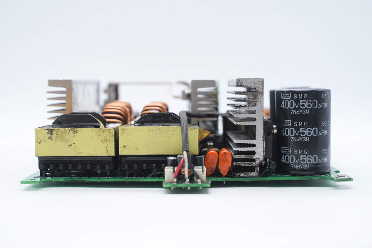 另一侧设有滤波电感,保险丝,共模电感,整流桥和整流桥散热片,高压滤波电容。