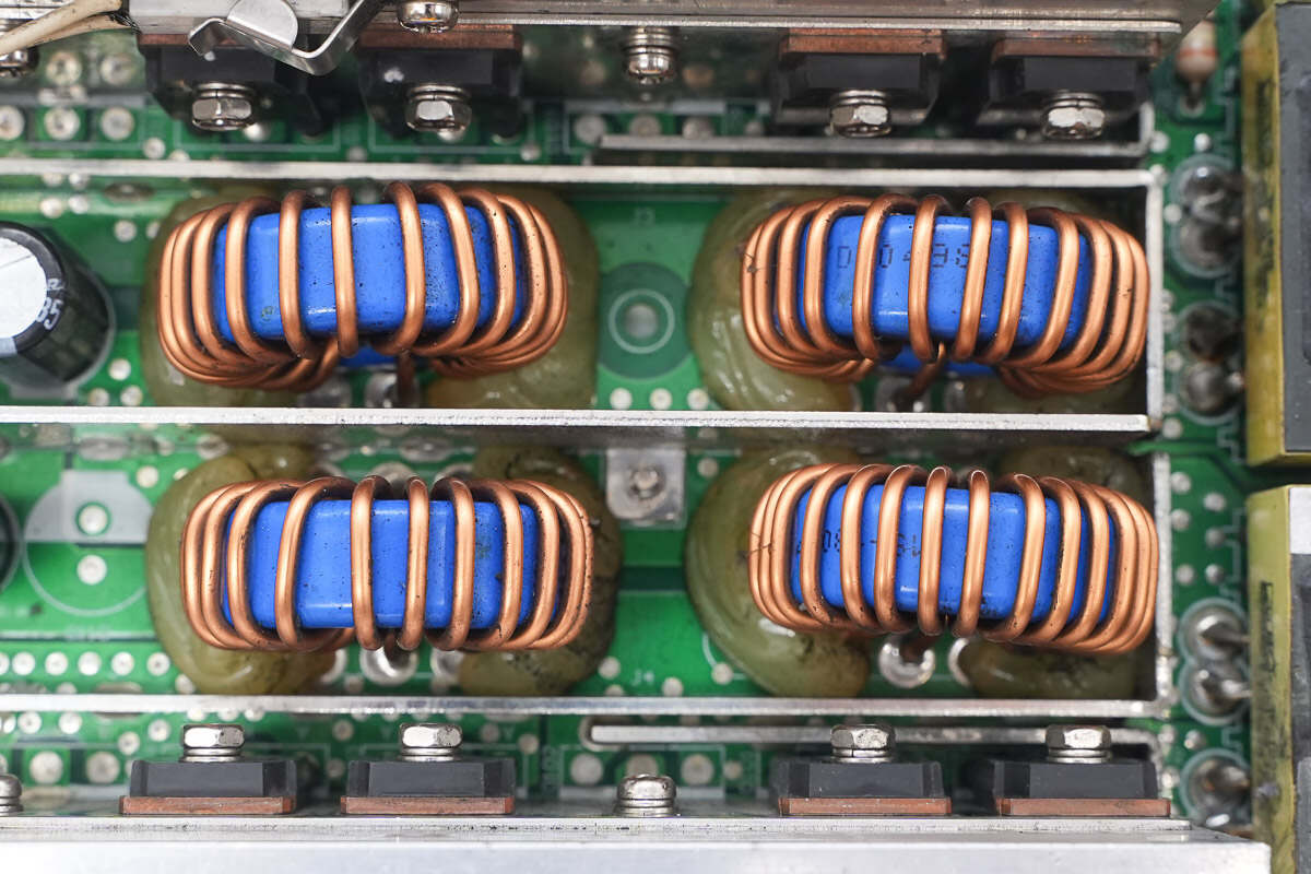 开关管下方设有变压器,左侧设有整流二极管,汇流铜排和散热片,中间设有滤波电感,左侧设有滤波电容和直流输出接线柱。左侧交流输入端和直流输出接线柱之间设有控制小板。
