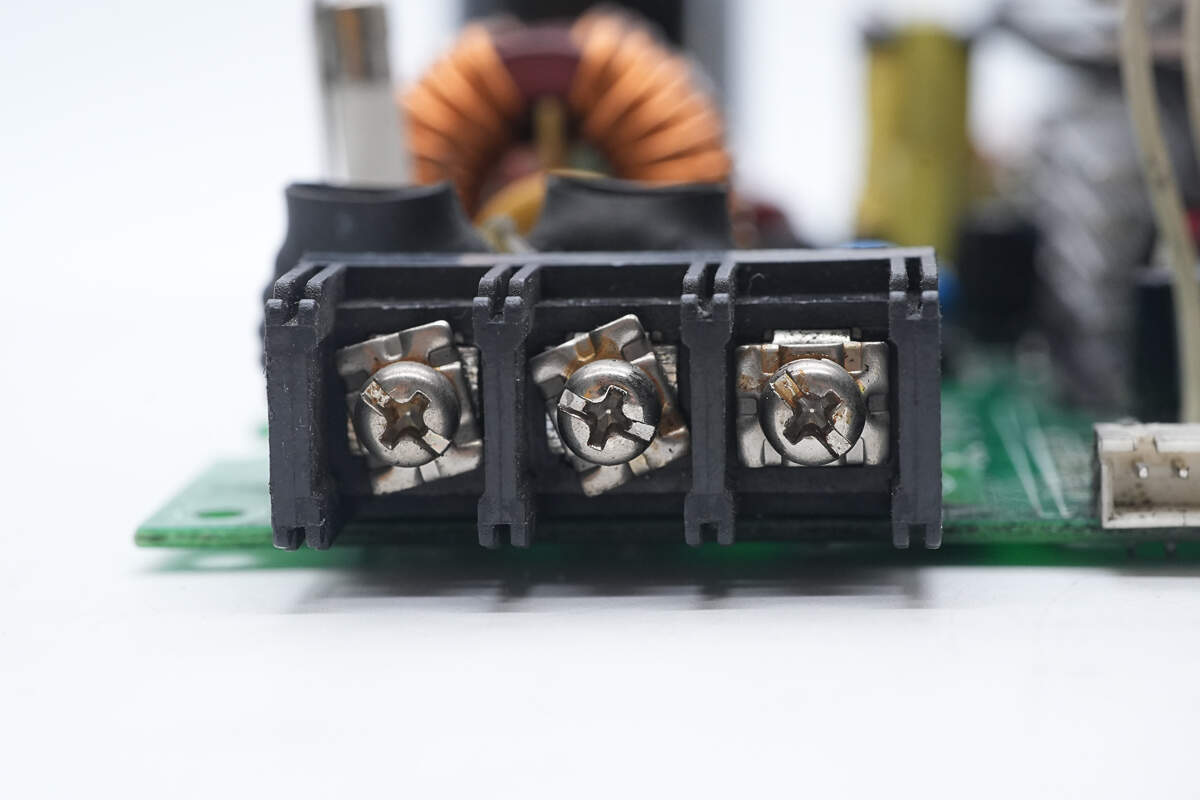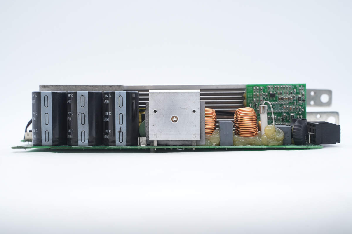 PCBA模块侧面一览,左侧设有交流接线端子,中间设有控制小板和控制端子,在控制小板上设有电位器,用于输出电压调节。右侧设有滤波电容和直流接线柱。
