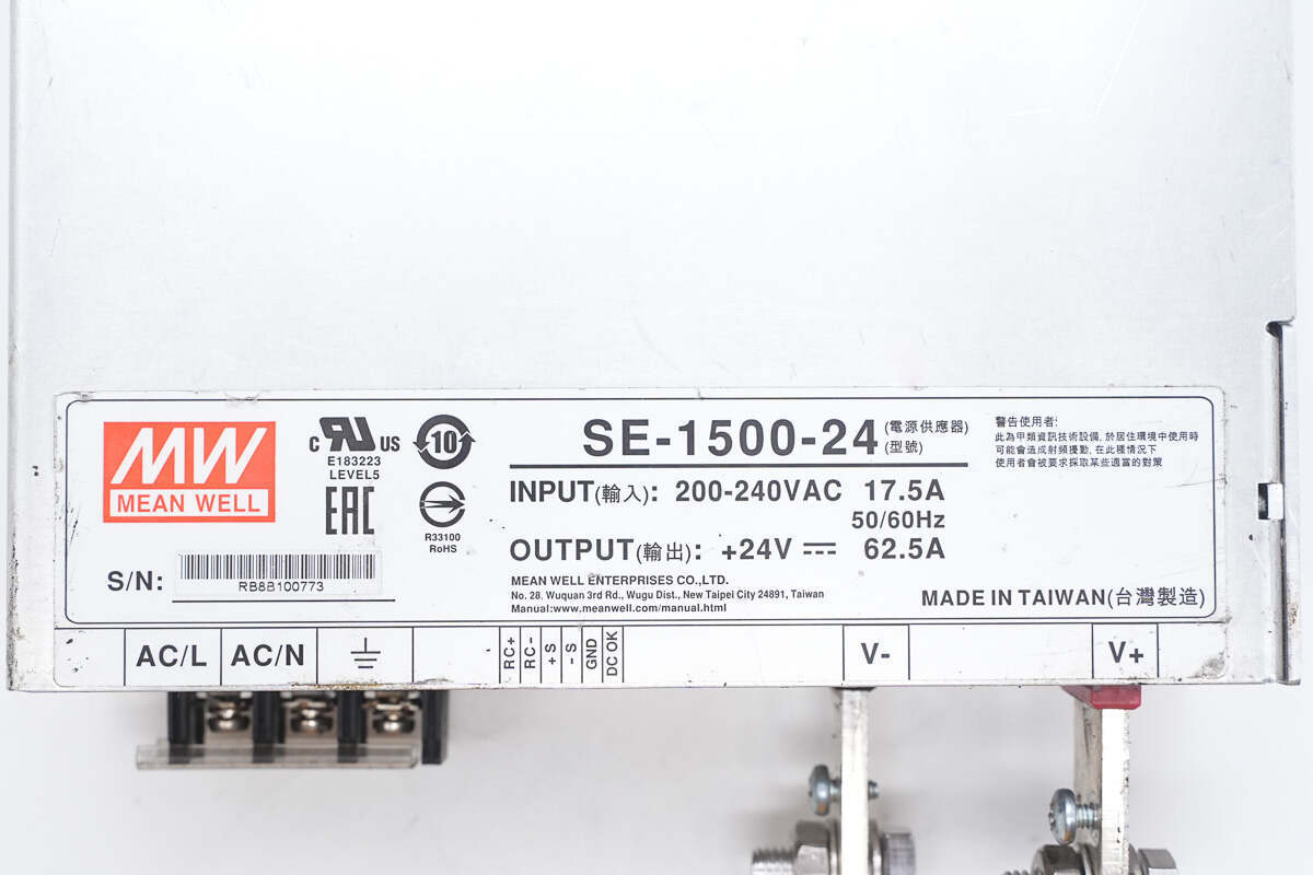 明纬1500W开关电源型号为SE-1500-24,采用铝合金外壳,内置散热风扇。电源支持200-240V输入电压,输出电压为24V,输出电流62.5A。电源尾部设有交流输入端子,直流输出接线柱和控制端子,支持远程控制。